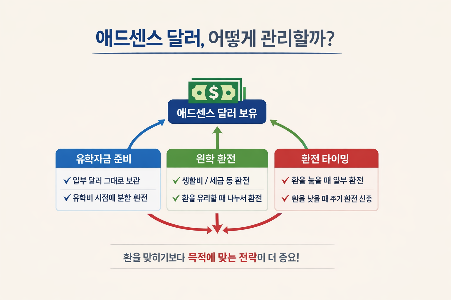 결국 선택의 기준은 단순합니다. 애드센스 달러를 투자 수익으로 볼 것인가, 아니면 미래 지출을 위한 준비 자금으로 볼 것인가. 유학 계획이 있다면 답은 이미 정해져 있습니다. 애드센스로 받은 달러를 무조건 원화로 바꾸지 않아도 됩니다. 오히려 그 달러를 지키는 것이, 가장 현실적인 선택일 수 있습니다.