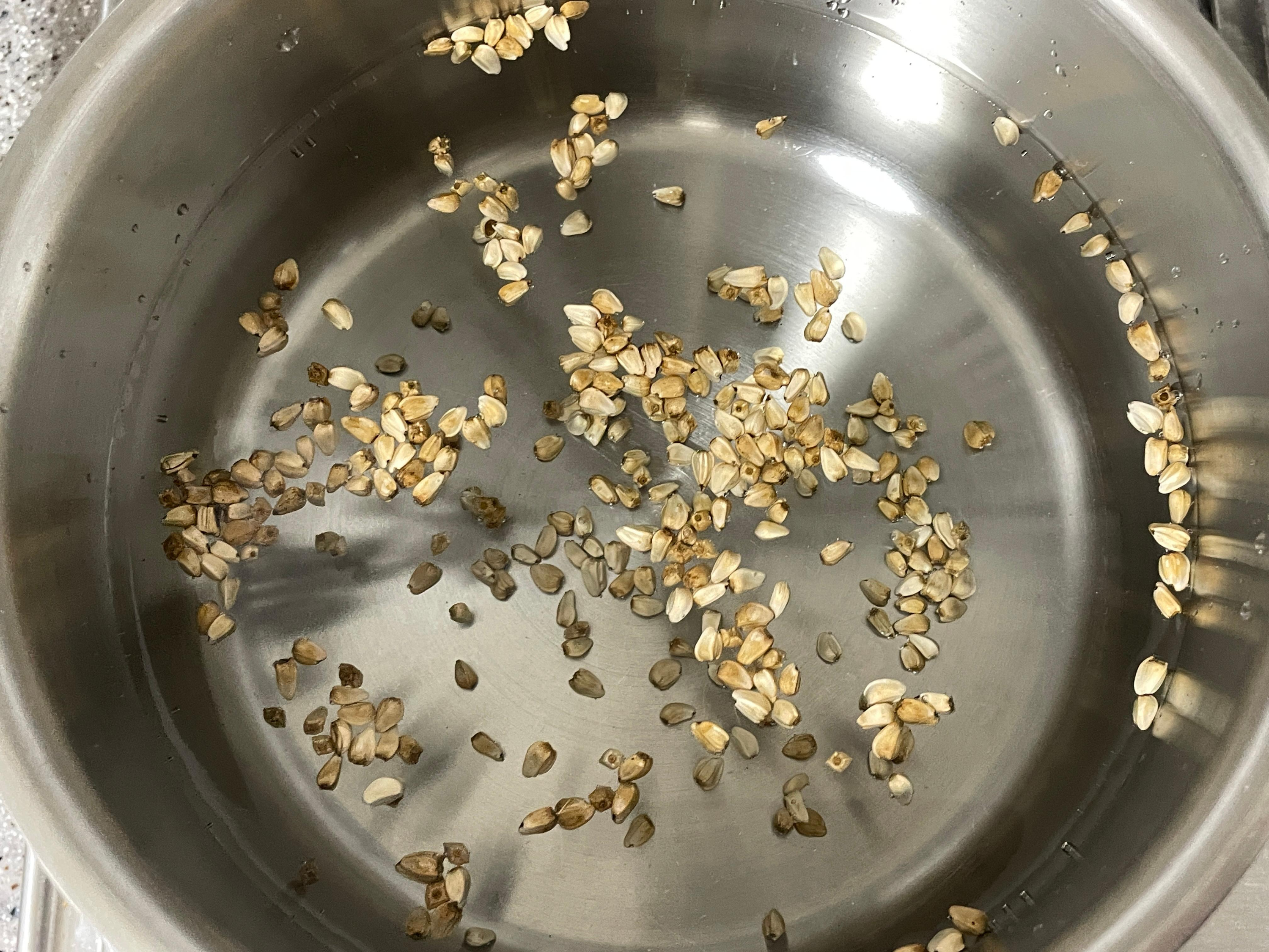 1. 먼저 넓은 그릇에 홍화씨를 담고 물을 부어 가볍게 저어준 후 조리로 건집니다.